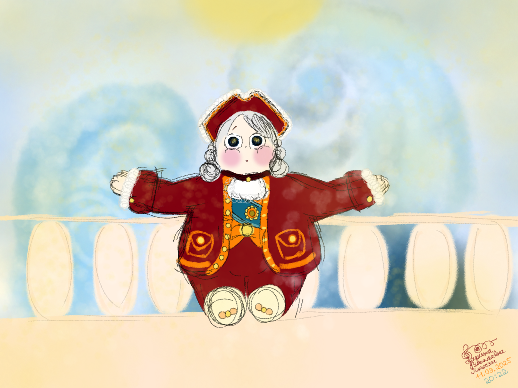 Вообще эта картинка должна жить в левой части экрана. Текст подписи к изображению. Картинка «Ожидание». Это у противоположного дома в моём дворе есть такая закрытая-презакрытая дверь, а перед ней, задумавшись, сидит мой персонажик.