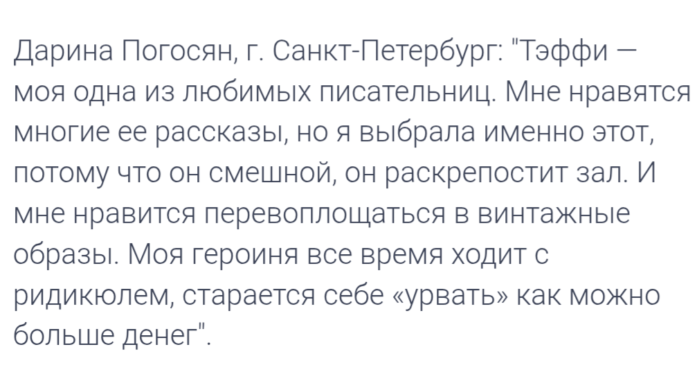 Поскольку сканированной работы устного тура не бывает по определению, в третьей ссылке я поделюсь своим выступлением на конкурсе чтецов. Я читала рассказ Надежды Тэффи «Пасхальные советы молодым хозяйкам». Это можно посмотреть!
